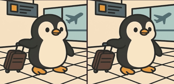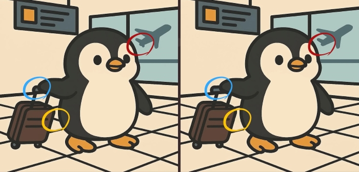 Allora, siete pronti per la prossima sfida? Osservate attentamente due immagini di un simpatico pinguino che trasporta i bagagli all’aeroporto. A prima vista possono sembrare identiche, ma in esse si nascondono 3 piccole differenze. Pensate di riuscire a trovarle tutte in 61 secondi? Provate e mettete alla prova la vostra acutezza visiva!