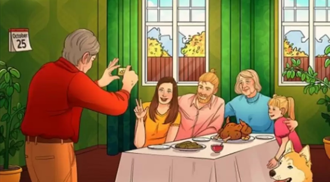 La data sul calendario dovrebbe essere il 22 ottobre. L’immagine mostra una famiglia che festeggia il Giorno del Ringraziamento, come suggerisce il tacchino al forno, piatto tradizionale di questa festa. In Ucraina, il Giorno del Ringraziamento cade il 22 ottobre.