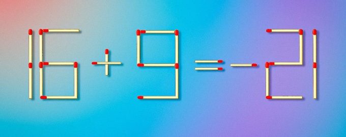 Nell’immagine – un’uglianza errata composta da 26 fiammiferi: 16 + 9 = -21. Il vostro compito è trascinare solo uno di essi per rendere l’uglianza corretta.