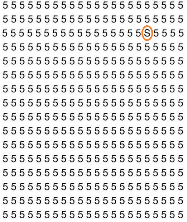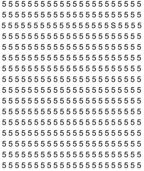 Nell’immagine si vedono molte cifre 5, disposte in righe e colonne. Osservando questa immagine, dai primi secondi potrebbe sembrare che non ci sia assolutamente la lettera S da nessuna parte. Ma non bisogna fidarsi di questa prima impressione: la lettera S c’è sicuramente, solo che non è così facile notarla.