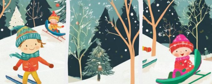Davanti a voi c’è un gruppo di bambini felici che si godono la neve e il vero clima invernale nella foresta. I più piccoli vanno in slitta e i loro amici più grandi sciano.