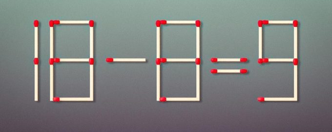 Qui di seguito vedrete un’immagine in cui l’uglianza 18-8=9 è rappresentata con l’aiuto di fiammiferi. Ovviamente, è matematicamente scorretta, perché la differenza di questi numeri dovrebbe essere 10.